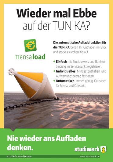 Der Mensa-Besuch wird vor allem auch mit der automatischen Aufladefunktion „mensaload“ stressfrei. Bereits 2016 bietet das Studiwerk Trier diese Variante der bargeldlosen Bezahlung an. Einfach mit dem Studiausweis oder dem Mitarbeiterausweis und der individuellen EC-Karte der Hausbank im StudiwerkOffice registrieren lassen. Mit der Einzugsermächtigung wird im Lastschriftverfahren ein individuelles Mindestguthaben automatisch aufgewertet. Jeder Kunde legt selber dieses Mindestguthaben fest.