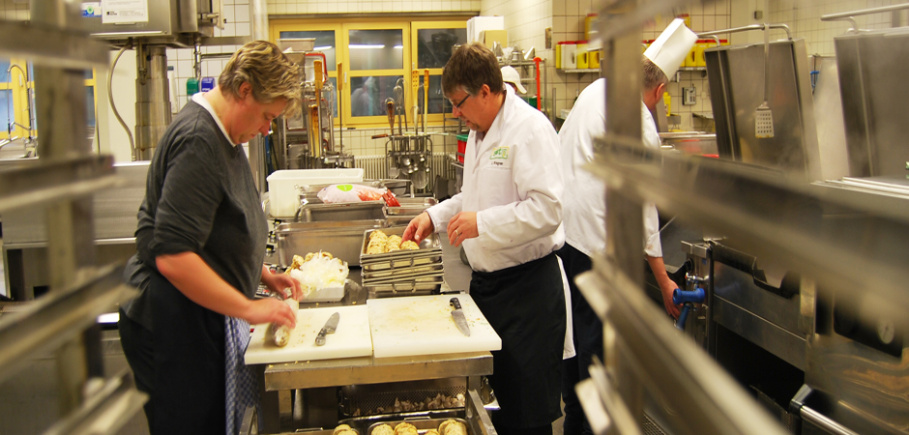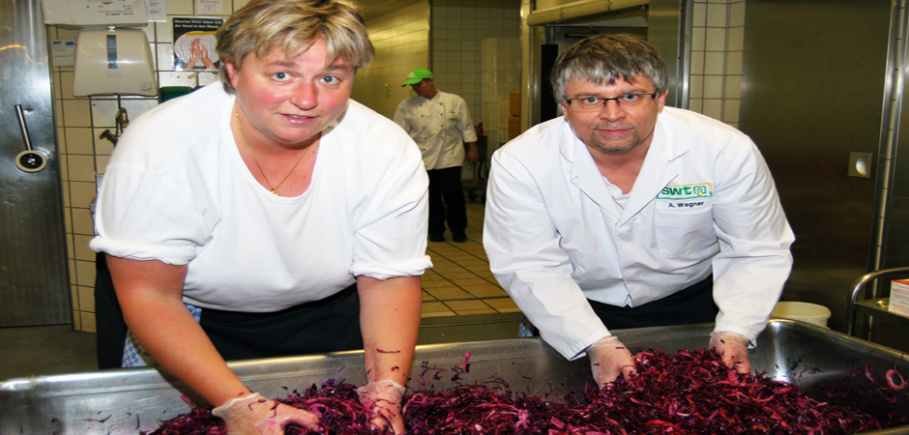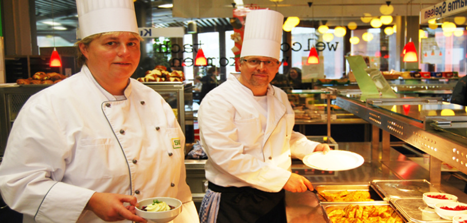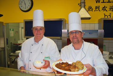 Am Dienstag 11. November schmeckte es den Gästen im Bistro A/B ganz besonders gut. Die Kanzlerin der Uni Trier Dr. Ulrike Graßnick und der Geschäftsführer im Studiwerk Andreas Wagner griffen persönlich zum Kochlöffel. Eine leckere Kürbiscreme-Suppe, Hirschgulasch mit Serviettenknödel nach Art des Hauses und eine feine rote Grütze mit Panna-Cotta Haube standen auf der Speisekarte. Natürlich übernahmen die beiden „ Chefs“ auch die anschließende Essensausgabe im Bistro A/B. „Die Zubereitung im Team hat mir sehr viel Spaß gemacht“, so Dr. Ulrike Graßnick und Andreas Wagner fügte hinzu: „ Besonders freut uns das große positive Echo auf unsere Aktion“.