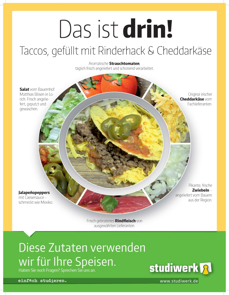 Mit großen Plakaten bietet das Studiwerk Trier heute am Donnerstag, 21.01., seinen Kunden einen ganz besonderen Einblick in die Mensa-Küche. "Das ist drin!" heißt das Motto für eine neue Plakatserie. Informationen zu allen Zutaten und Lieferanten zum Beispiel für das Gericht "Taccos nach mexikanischer Art", können die Gäste in der Mensa Tarforst heute erfahren. Die Resonanz war sehr positiv.