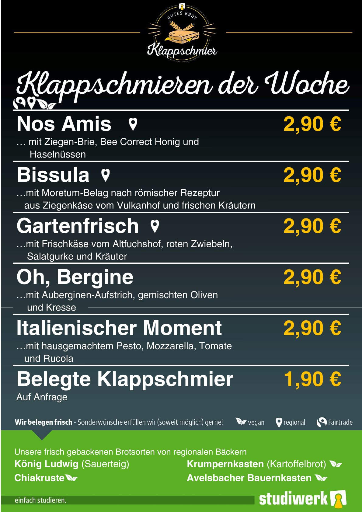 Die Klappschmieren in der neuen Kalenderwoche in Tarforst. Wir empfehlen Ihnen unseren Dauerrenner "Italienischer Moment" mit hausgemachtem Pesto, Tomate und Mozzarella.