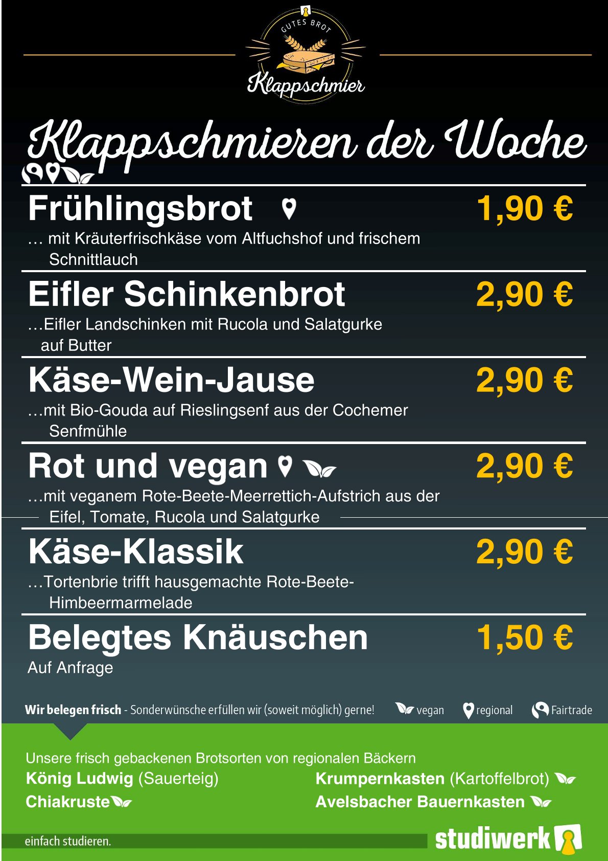 Die Klappschmieren in der neuen Kalenderwoche in Tarforst. Wir empfehlen Ihnen unsere Klappschmier "Käse-Wein-Jause" mit Bio-Gouda und regionalem Senf.