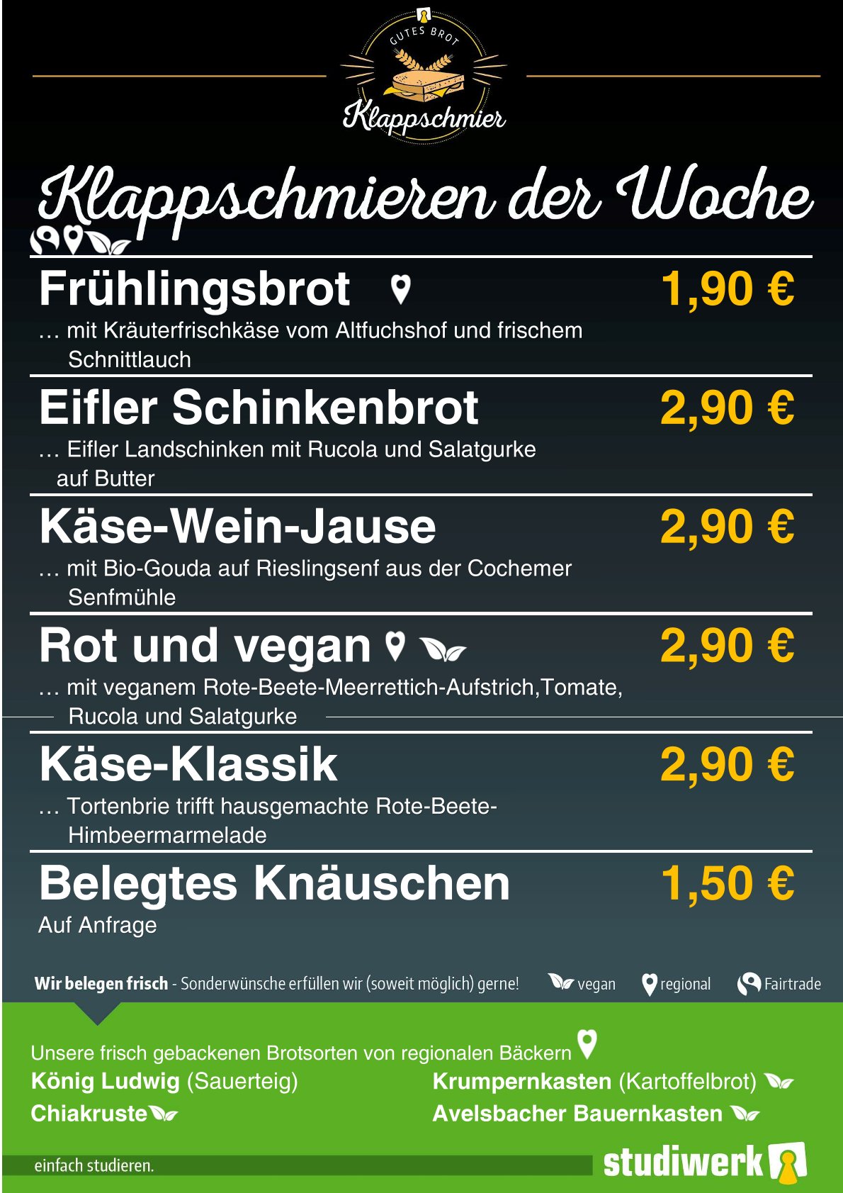 Die Klappschmieren in der neuen Kalenderwoche in Tarforst. Wir empfehlen unsere Klappschmier "Käse-Klassik" mit hausgemachter Marmelade und Tortenbrie.