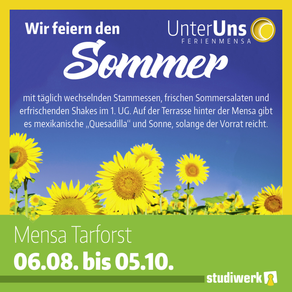 Wir feiern den Sommer in der Mensa Tarforst mit der UnterUns Ferienmensa. Wir bieten ein täglich wechselndes Stammessen mit frischen Salaten und leckeren Shakes im 1. UG an. Auf der Terrasse hinter der Mensa steht unsere Studiwerk-Hütte. Hier gibt es mexikanische "Quesadilla" und natürlich Sonne, solange der Vorrat reicht. An der Hütte verwenden wir Einweggeschirr, das aus nachwachsenden Rohstoffen produziert wird und zu 100 % biologisch abbaubar ist. Das Studiwerk Trier wünscht guten Appetit!