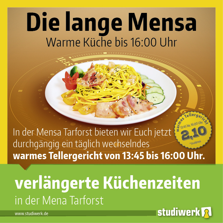 Ab Montag 11. Dezember verlängern sich die Öffnungszeiten in der Mensa-Tarforst. An Theke 3 wird es durchgängig von Montag bis Donnerstag ein täglich wechselndes warmes Tellergericht von 13:45 bis 16:00 Uhr geben. Der Preis beträgt für die Hauptkomponente mit Beilage für STUDIS nur 2,10 EURO. Damit setzt das Studiwerk Trier bereits erste Ergebnisse aus der wissenschaftlichen Befragung seiner Gäste um. Ein großer Wunsch waren längere Öffnungszeiten in der Mensa.