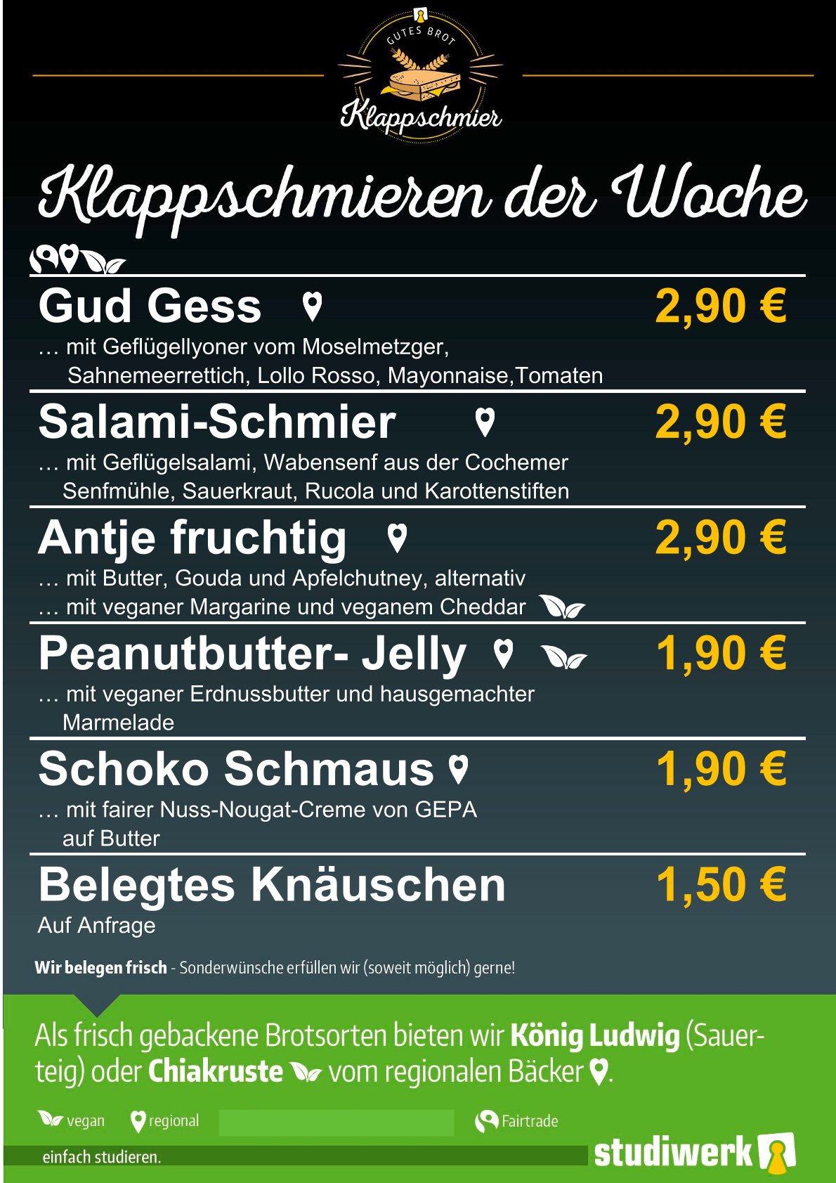 Wir starten in die neue Klappschmierwoche und empfehlen unser "Gud Gess". Mit Geflügellyoner vom Moselmetzger. Auf Wunsch belegen wir auch gerne - je nach Verfügbarkeit - individuell.