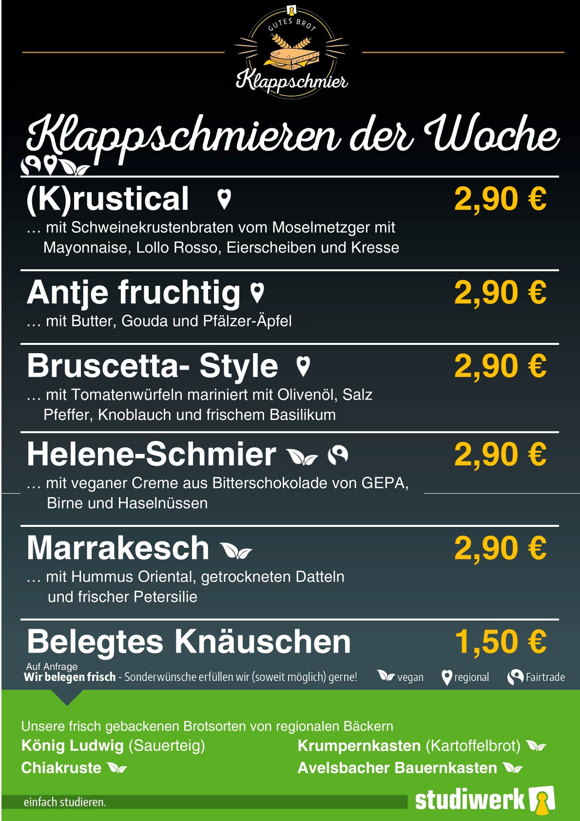 Die Klappschmieren in der neuen Kalenderwoche in Tarforst. Wir empfehlen Ihnen unsere Klappschmier "Peanutbutter-Jelly" mit hausgemachten Fruchtaufstrich und verganer Erdnussbutter.