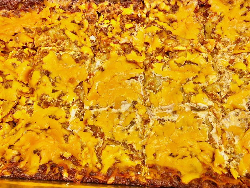 Tomatenwürfel und Fetawürfel abwechseln schichten. Jede Schicht mit etwas Sauce bedecken.Mit geriebenem Käse (wir haben hier Cheddar ausprobiert) bestreuen und bei 175 Grad ca. 45 Minuten im Ofen backen.